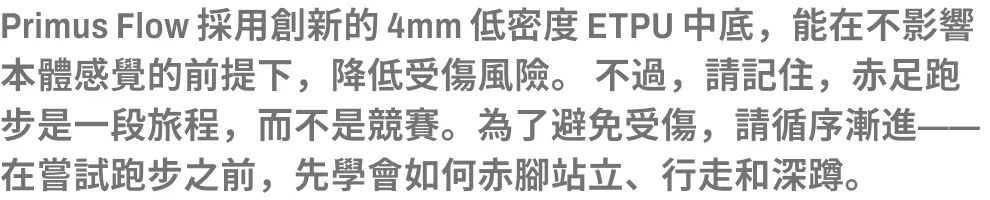 Primus Flow 是 Primus 系列的最新鞋款,專為極致赤足跑而設計。這款超輕量跑鞋——重量僅 150 克,除了是我們最輕量的跑鞋,更旨在提供高效無拘無束的自然運動體驗。鞋面採用輕盈透氣的工程回收網布製成,捨棄多餘覆層,採用極簡無縫設計,讓雙腳享受純粹的自由感。