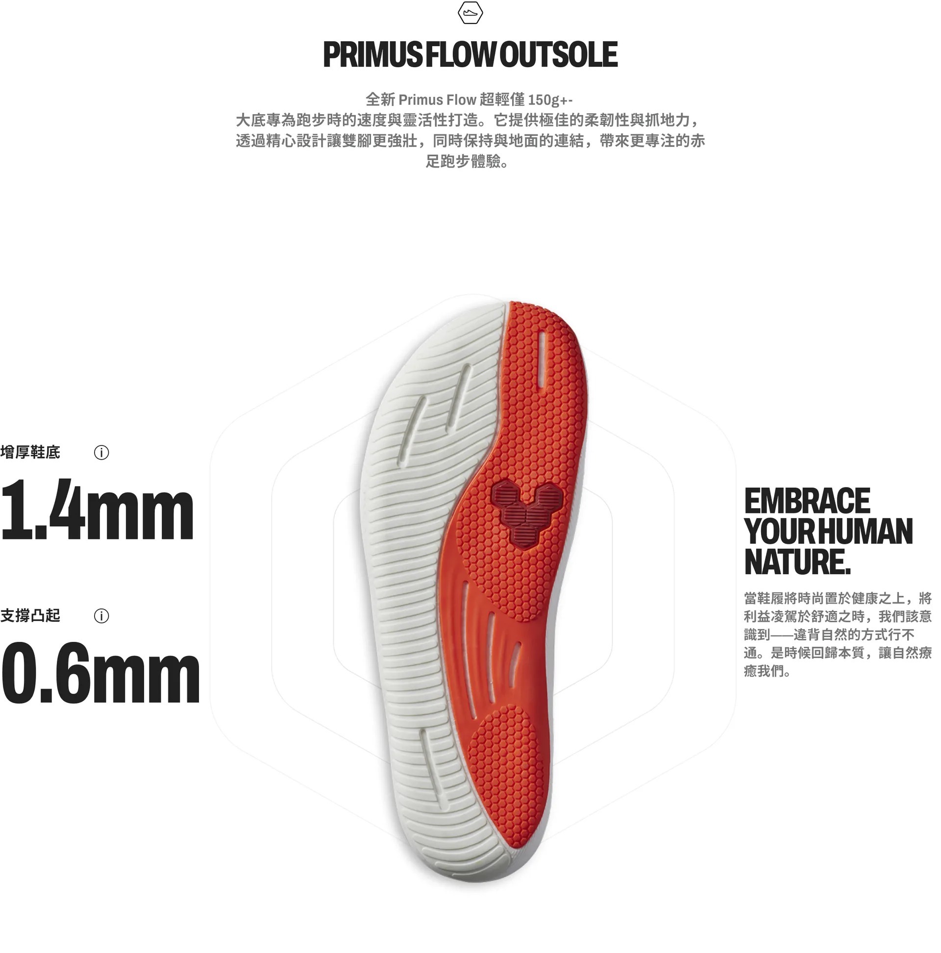 Primus Flow 是 Primus 系列的最新鞋款,專為極致赤足跑而設計。這款超輕量跑鞋——重量僅 150 克,除了是我們最輕量的跑鞋,更旨在提供高效無拘無束的自然運動體驗。鞋面採用輕盈透氣的工程回收網布製成,捨棄多餘覆層,採用極簡無縫設計,讓雙腳享受純粹的自由感。