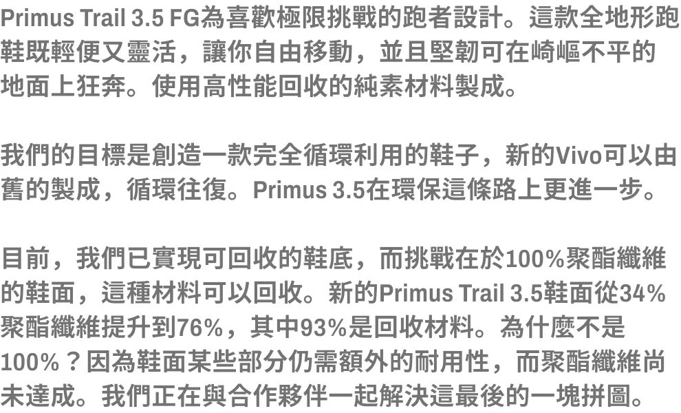 在山野釋放你的野性,並重新親近大自然 Primus Trail 3.5 FG是一款輕量化、耐用且具備高彈性的越野跑訓練鞋,且更加的環保。