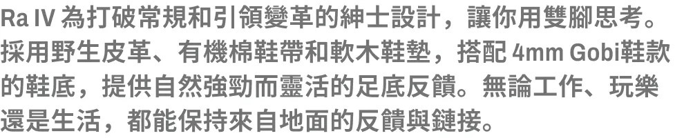 Ra IV 是款經典的英倫牛津鞋,融合了赤足靈魂,讓雙腳更強壯、更自由。鞋面優雅,鞋底強大。
